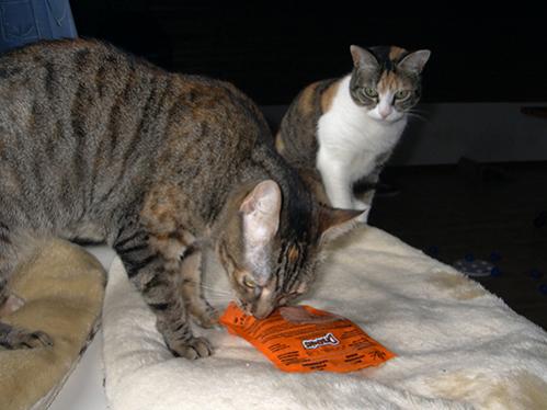 Hyazinth hat gelegentlich Kinnakne. Ich trickse sie aus, indem ich beiläufig ihr Kinn einsalbe, während sie in der Fütterungshektik auf der Arbeitsplatte rumläuft.
